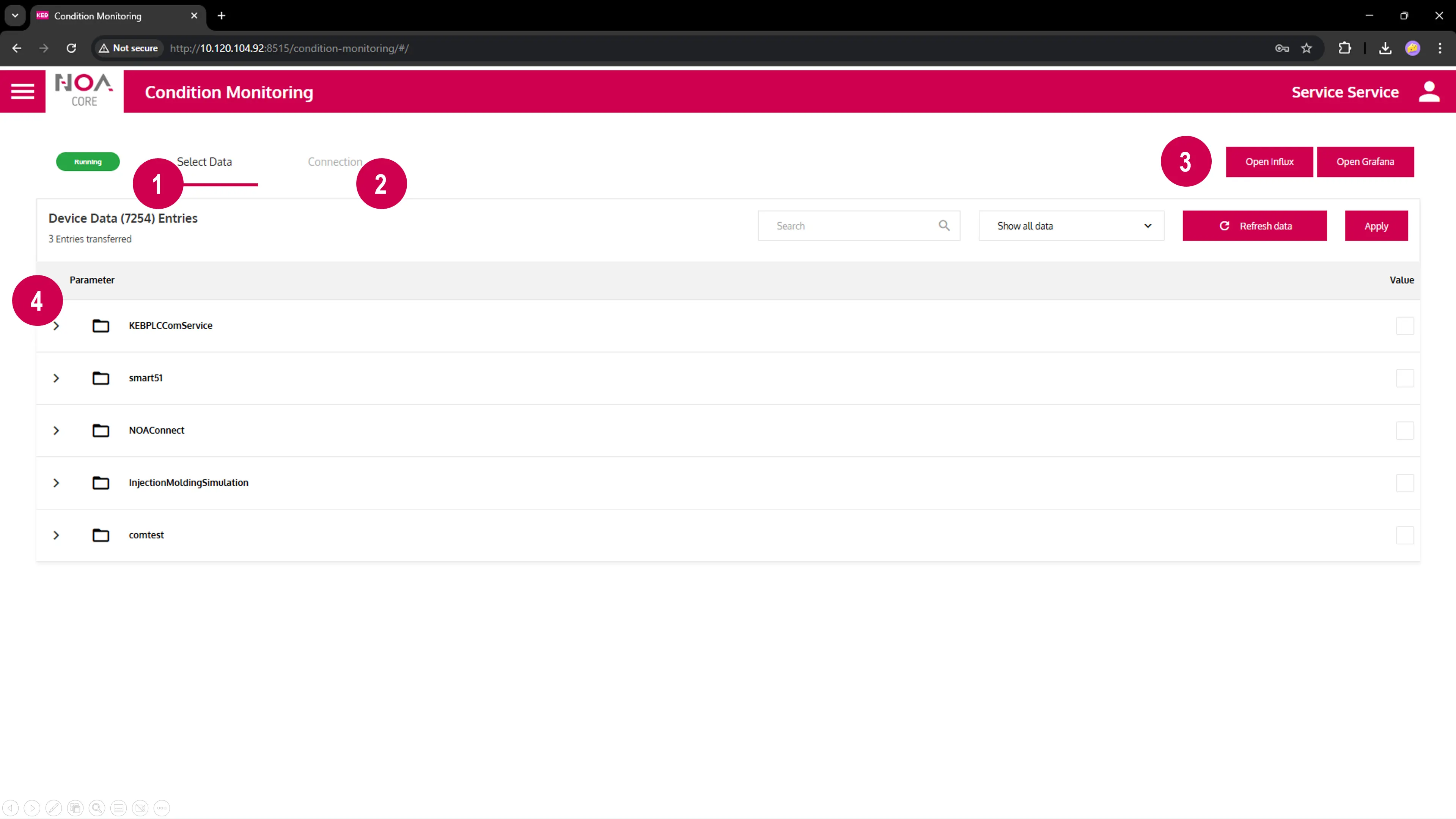 - Open the Influx app in a new tab with the corresponding button in the Condition Monitoring app.