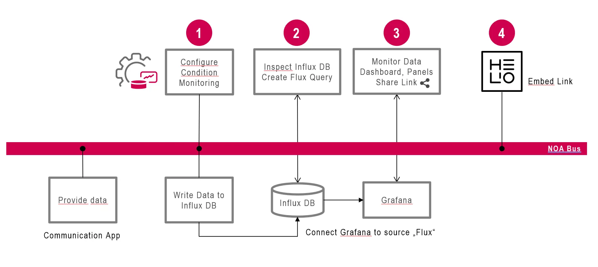 Store any data on the NOA Bus to an Influx database for further analysis. The Condition Monitoring app bundles Influx and Grafana as local apps.