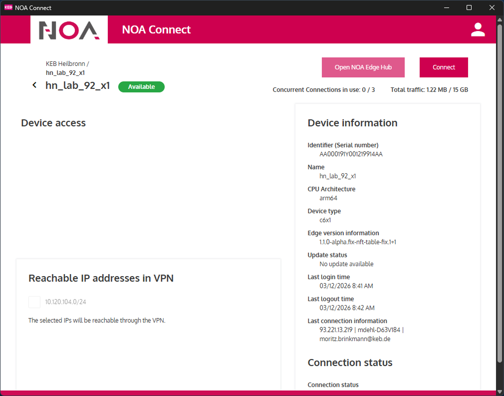 Click in the tile "NOA Connect" to open the app. The current connection is shown in the list of active connections.
