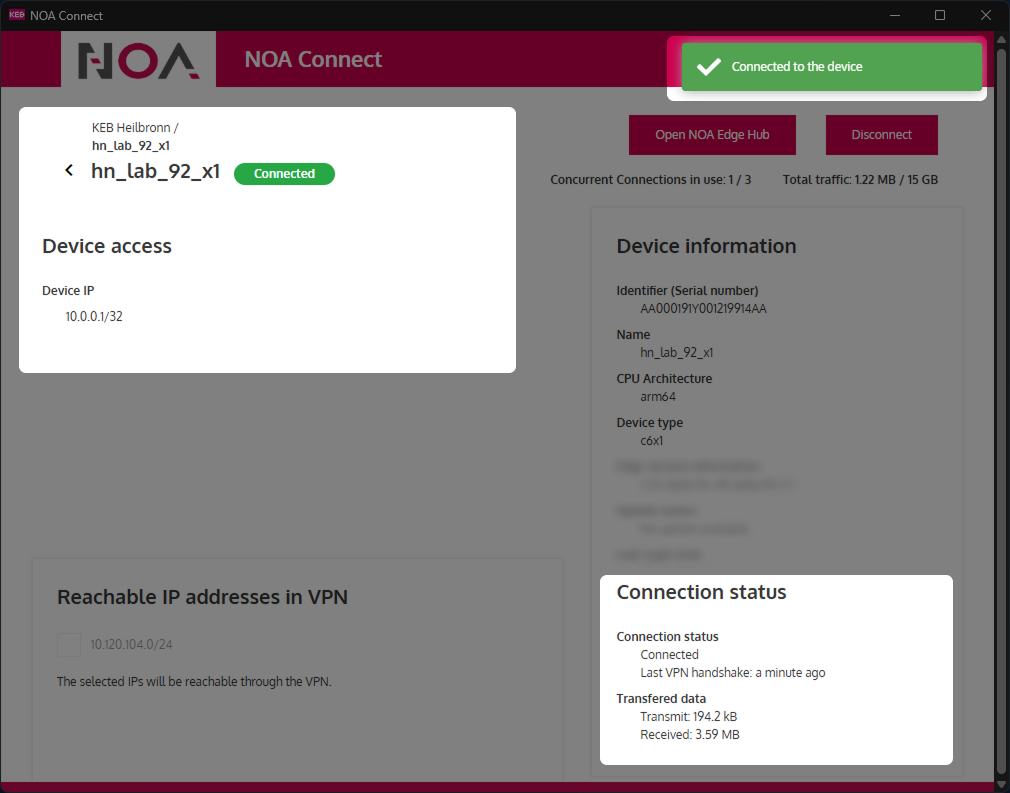infoIf enabled on the edge device in the NOA Connect app the remote connection can be extended to subnets connected with the target device.