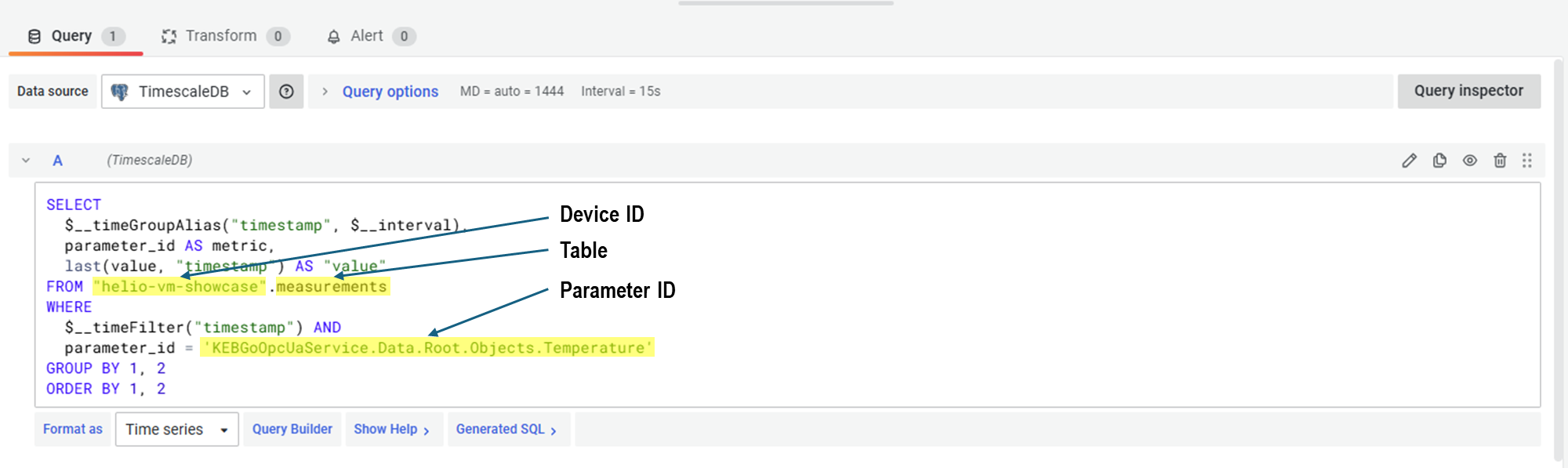In the image below, you can see how you can write a Grafana query based on the structure of the database explained above. The device ID, parameter ID and